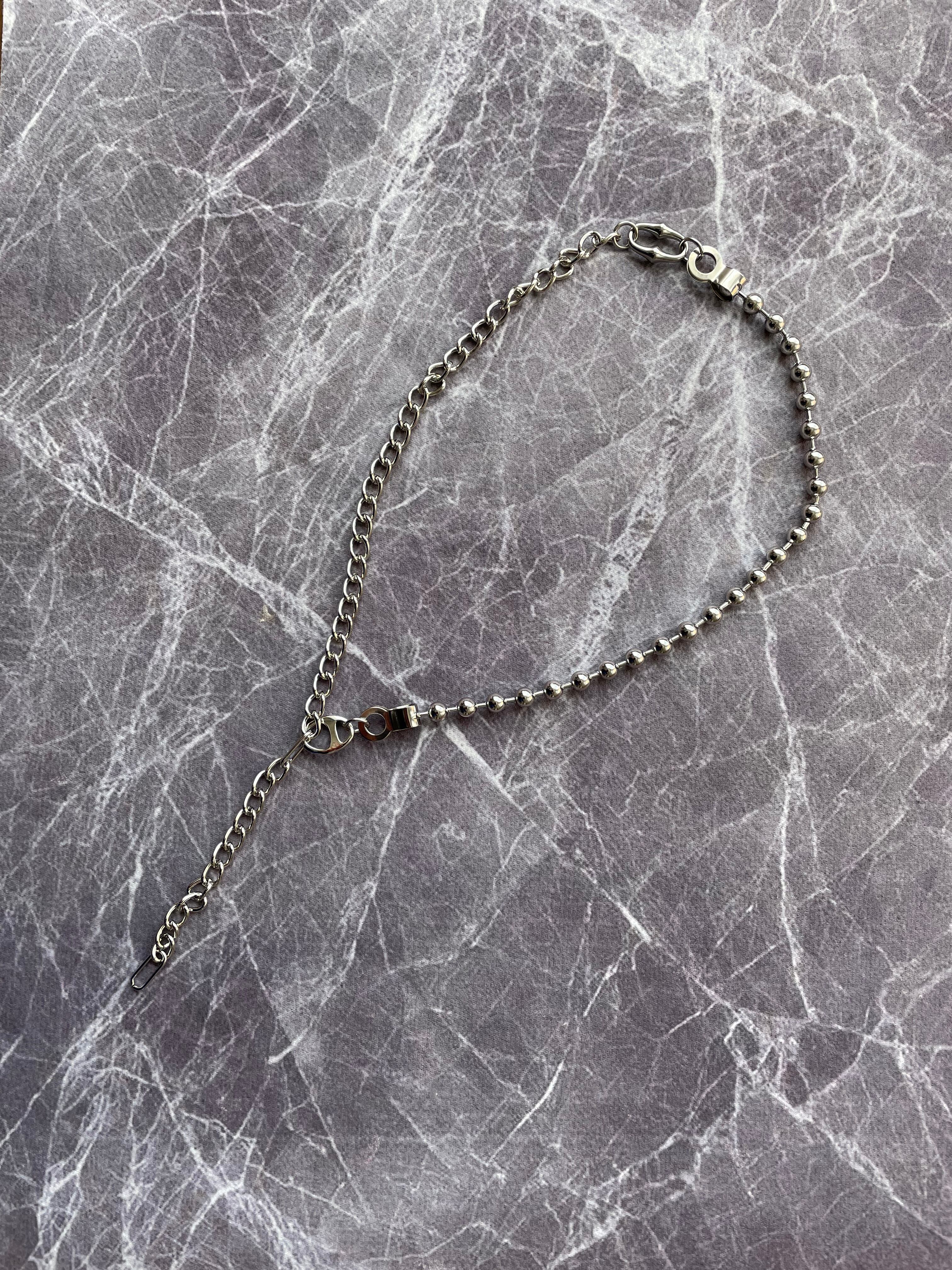 異なる種類のチェーンを繋ぎ、留め具の位置を変えて楽しめるネックレスにしました。 Y字で使ってもよし、先端で留めて普通に丸で使っても良し。 ステンレス製で金属アレルギー対応